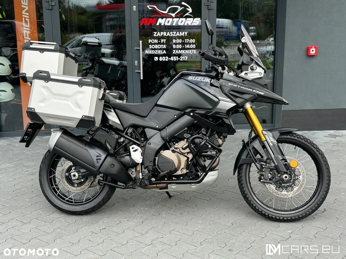 Suzuki DL 1050 V Strom DE z 2023 roku w pełnym wyposażeniu ABS , TCS , Mapy zapłonu , Tempomat , wyświetlacz TFT . Doposażenie opcjonalne (Zestaw 3 kufrów OEM aluminiowych , Gmole Ochronne + Halogeny LED , stopka centralna itd.). Motocykl świeżo sprowadzony z Włoch , (Jeden właściciel od nowości , posiadamy zdjęcia z dnia zakupu) - kupujący otrzymuje komplet dokumentów do rejestracji . Koszt rejestracji to 190 zł - wystawiam fakturę VAT marża . Przebieg 58 028 km ! ( autentyczny , wpisywany na fakturę ) dwa komplety kluczyków . Oferta skierowana do wymagających klientów którzy mają już dość jeżdżenia i oglądania powypadkowych egzemplarzy z wątpliwym przebiegiem i historią ... Gwarancja zadowolenia po przyjeździe !! Silnik odpala na dotyk zimny czy ciepły , pracuję cicho i równomiernie . Skrzynia biegów oraz sprzęgło działają prawidłowo . Opony około 70/80% bieżnika DOT 1225/4724 . Tarcze hamulcowe oryginalne w bardzo dobrym stanie , adekwatnym do przebiegu , klocki hamulcowe zarówno przód jak i tył około 80% okładzin . Układ napędowy ma około 70% naciągu do wykorzystania . Motocykl bez luzów na zawieszeniu czy wycieków . Wizualnie V strom prezentuję się jak na załączonych zdjęciach , jest czysty i zadbany , bez rdzy (lakier na felgach , silniku , ramie itd w bardzo ładnym stanie ) . Bardzo ładny kolor (czarna perła w połączeniu z szarymi dodatkami) , motocykl jeździ idealnie prosto . Posiada normalne ślady eksploatacji . Motocykl wyposażony , Gotowy do turystyki . Zapraszam na oględziny i jazdę próbną a jestem pewien że pierwszy poważny klient go kupi ze względu na jego świetny stan techniczny i wizualny oraz doposażenie !! Konkurencja dla Kawasaki Versys 1000 , Honda Xl Varadero Africa TWIN 1100 CRF , Ducati Multistrada 950 xt enduro lub 1200 BMW GS Adv 1150 DE 800 . Yamaha Super tenere xtz , Triumph Tiger XCa , XC . Wszelkie pytania proszę kierować pod nr tel. Możliwy jest transport 1,5zl/km (wysyłka cały kraj 600 zł brutto ) oraz sprzedaż w Systemie Ratalnym poprzez bank . Możliwość przesłania około 60 szczegółowych zdjęć na E mail lub Whatsapp .